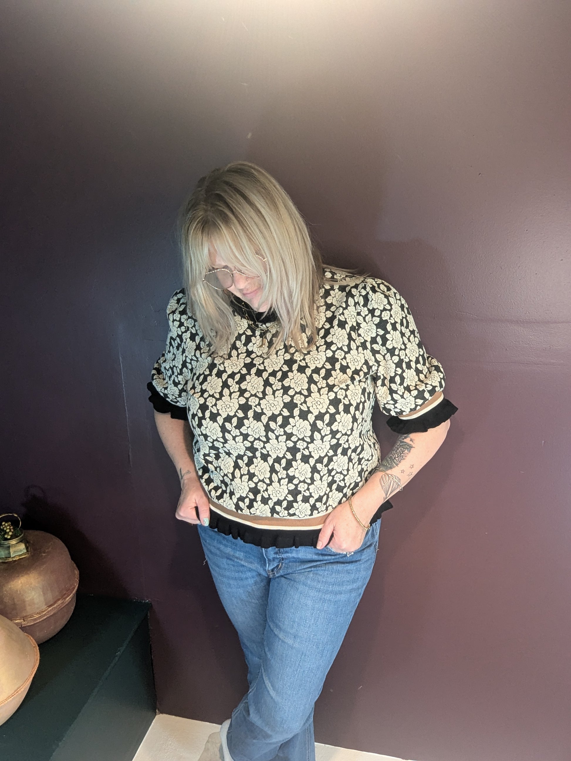Be wild and whimsical in our A Rose is a Rose Sweater! This short sleeve sweater features white roses on a black background with tan and creme accents, as well as ruffle details on the sleeves and waistband. Made with 80% polyester and 20% spandex, it's the perfect mix of comfort and style.