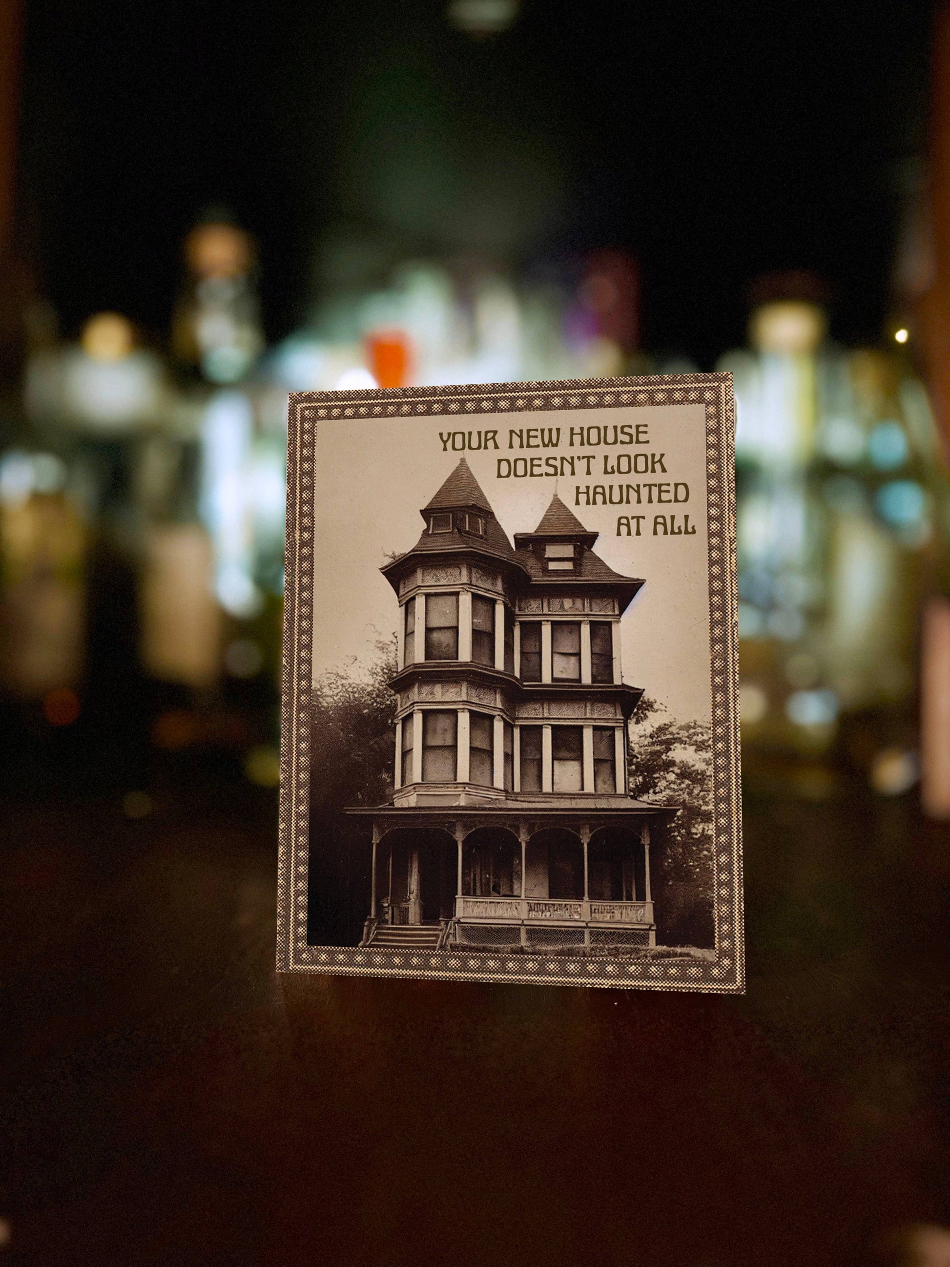 You know when you move into a new place and you hear random sounds coming from the heater and you start wondering if your home was built on an ancient burial ground or something. Fun card for new home owners or moving. Pretty classic victorian house old photo in sepia tones that looks perfect for the Addams Family, Elvira or a bunch of vampires.