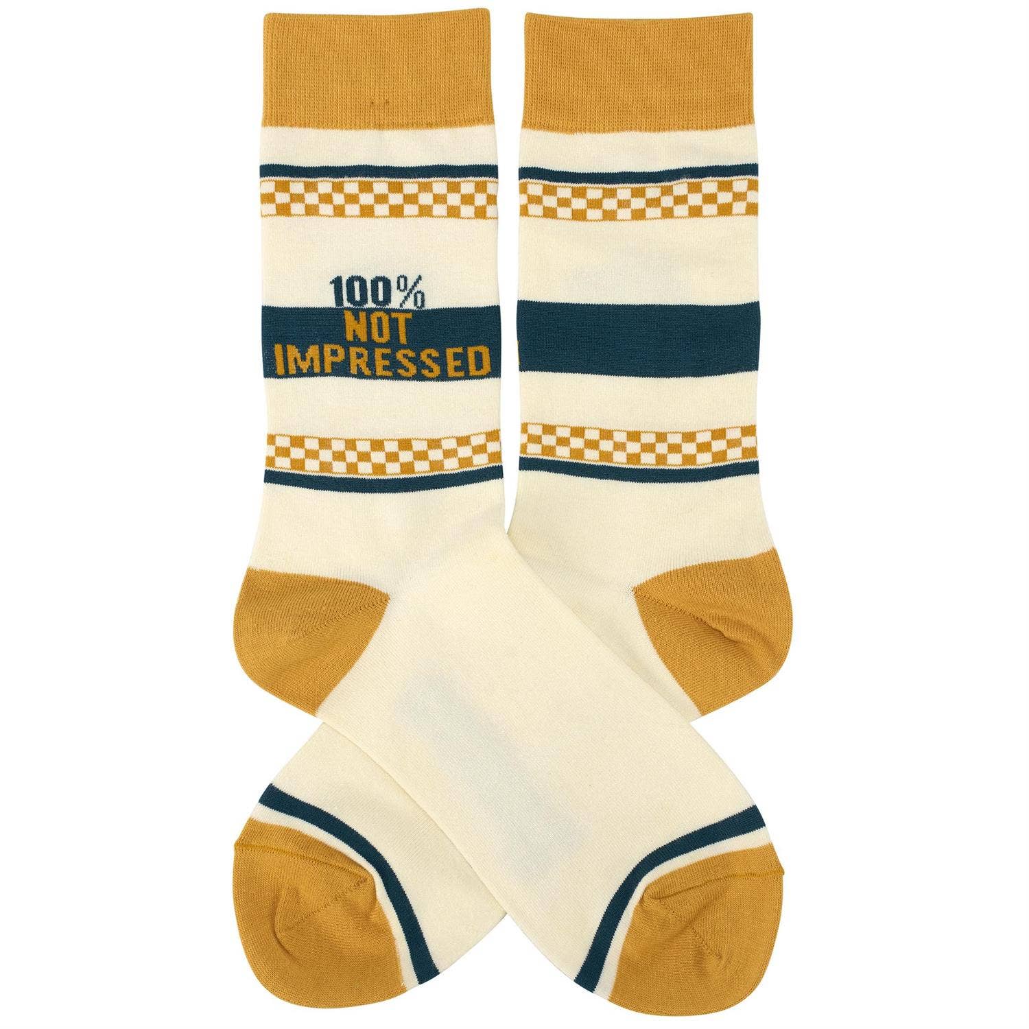 With your feet up, and nose up even higher, this pair of colorful socks flaunts a stylish tube sock pattern with a sassy sentiment that reads "100% Not Impressed." Questionables socks are made with a cotton, nylon, and spandex blend for a one size fits most design and packaged on a clear plastic hanger with header card for graceful display in store. Our Not Impressed socks are perfect for standing out and making a statement while getting a giggle out of others. Colorful and cozy socks always make a great gift that offer new ways to express themselves every day.