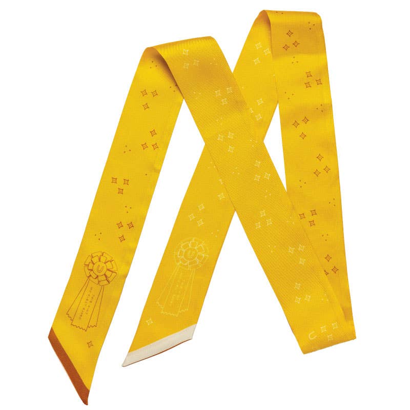 i have LOVED creating these hand-illustrated, buttery-soft, full-color 100% silk scarves. this one is a twilly. it's a fun, tie scarf meant to add a little disruptive style to your wardrobe. with a classic equestrian ribbon with the mantra "this ain't my first rodeo" this thin scarf adds effortless style to a basic tee or dresses up a crisp white shirt. these come in a beautiful vellum package that make it perfect for gift giving! color - mustard with copper and cream accents 1.5" X 55" 100% silk dry clean © jenni earle 2025